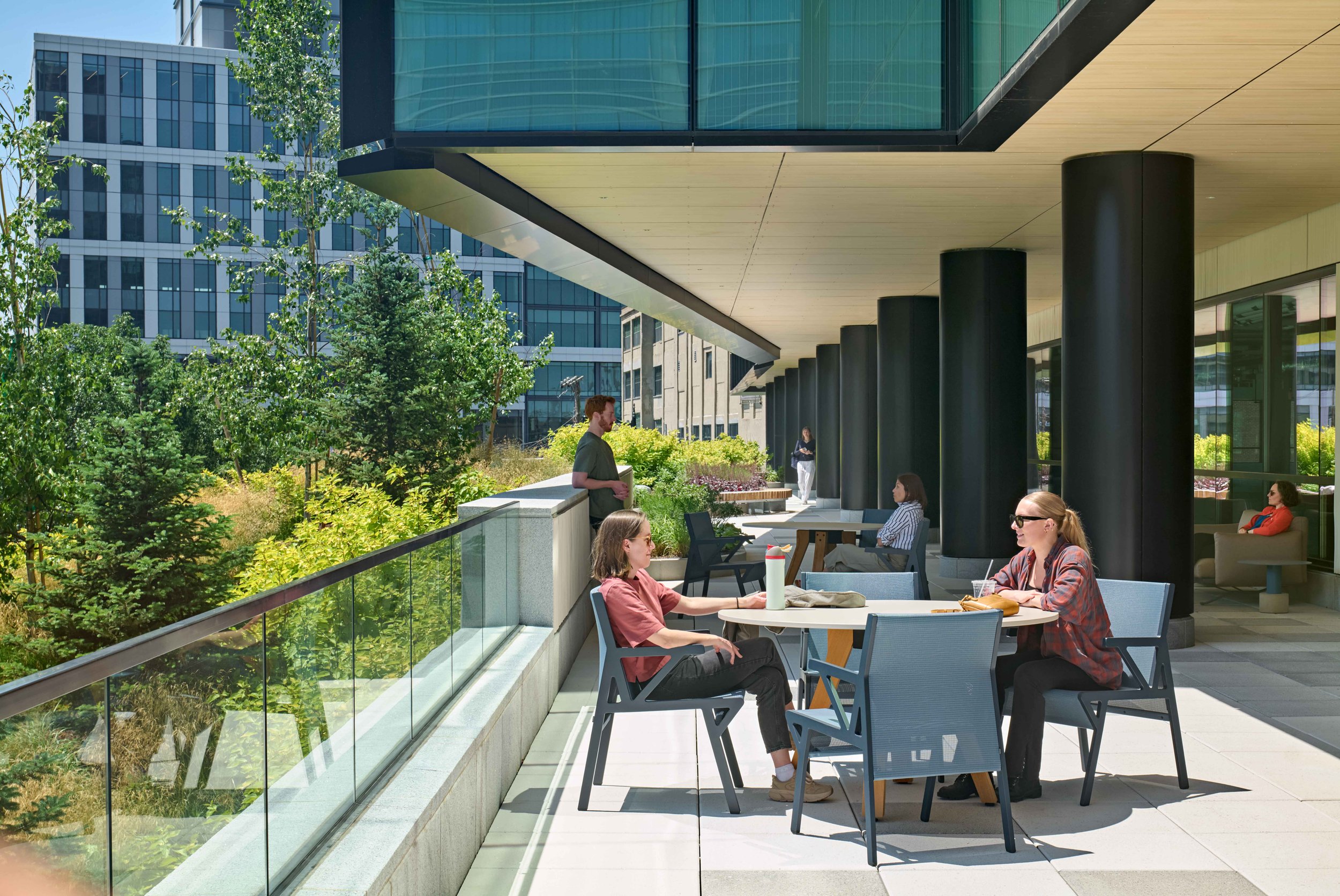 Twenty percent of the development site is deeded to the City and designated as publicly-owned civic space. Included in this civic space is a half-acre common known as “The Yard.” Comprised of a flexible lawn and plaza for pop-up events and other community-based programs, The Yard is seen as the green heart of the development. Primary buildings border the space with their entries and activated storefronts facing the common. In addition to The Yard, a quarter-acre public green containing community gardens and an integrated green infrastructure stormwater management area was deeded to the City.