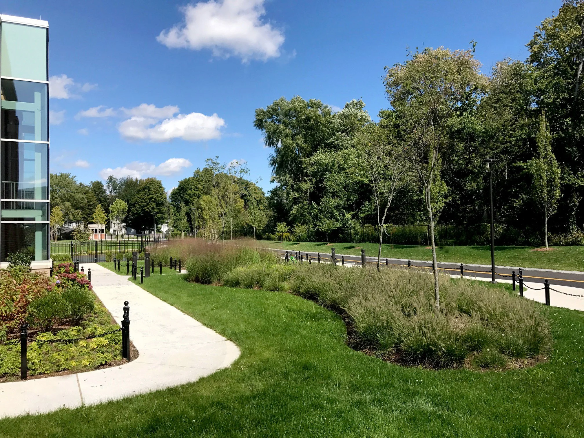 Copley Wolff was responsible for the design of exterior spaces including sports and recreational areas such as sports fields, basketball courts, and two playgrounds. The site design also includes pedestrian walks focused on the three main entry points to the school. These spaces serve as plazas for gathering during drop-off and pick-up activities.