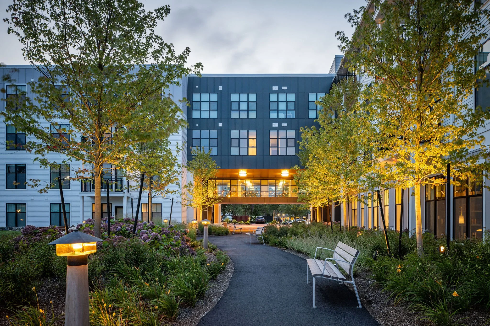 Copley Wolff collaborated with the architect and developer on site planning and design for two courtyards and a streetscape design that integrates a series of residential porches and outdoor dining patios, carefully situated around preserved mature trees. The western courtyard is designed as a publicly accessible open space for the neighborhood with a central lawn, meandering garden paths, and ample seating opportunities.
