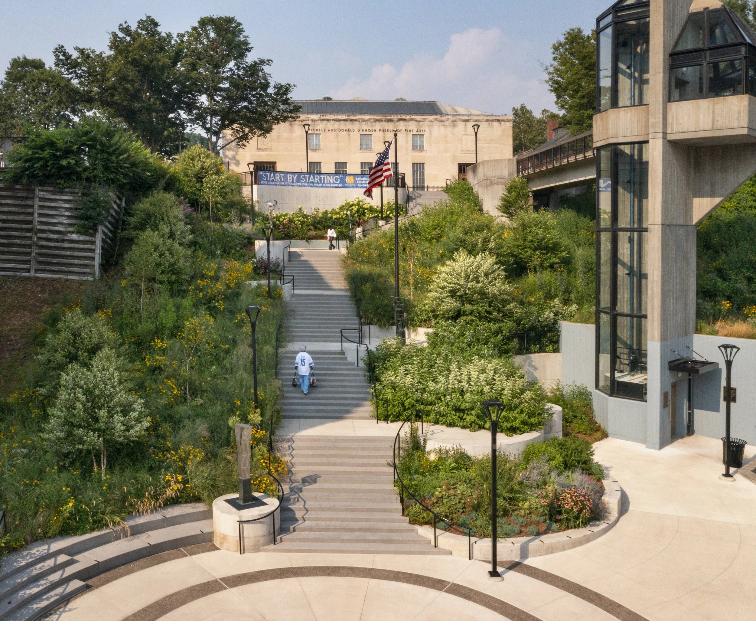 The design also features a renovated elevator as an integral architectural element to help visitors surmount the 40-foot change in elevation from the Park’s downtown location up to the Quadrangle, the cluster of museums, and numerous cultural institutions in Springfield’s Metro Center.