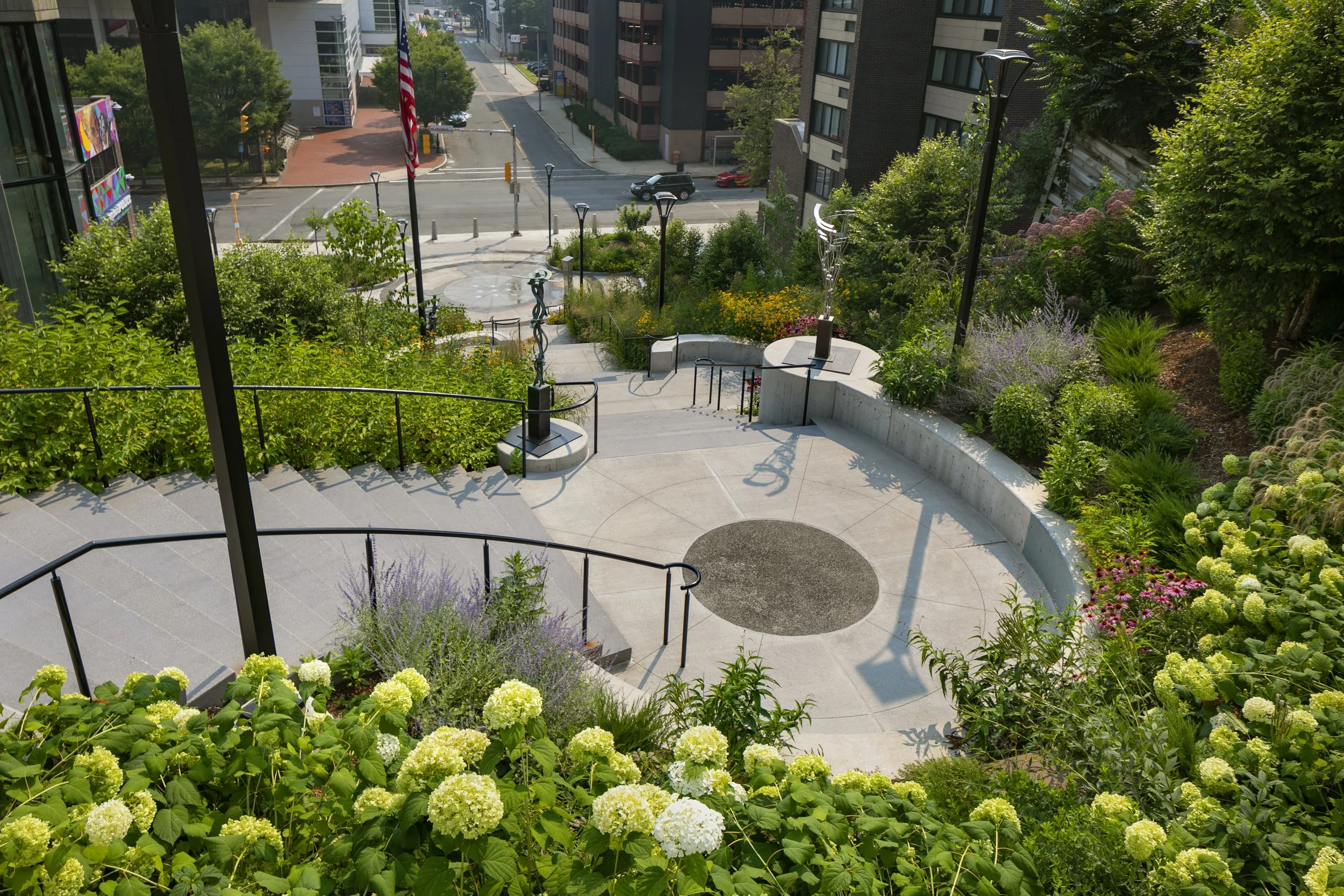 The new design includes a central plaza with an interactive water feature, seating areas, plantings, a monumental staircase featuring a series of overlook landings with seat walls, rotating art installations, improved pedestrian access, infrastructure updates, multi-faceted green spaces and gathering areas, and upgraded utility connections.